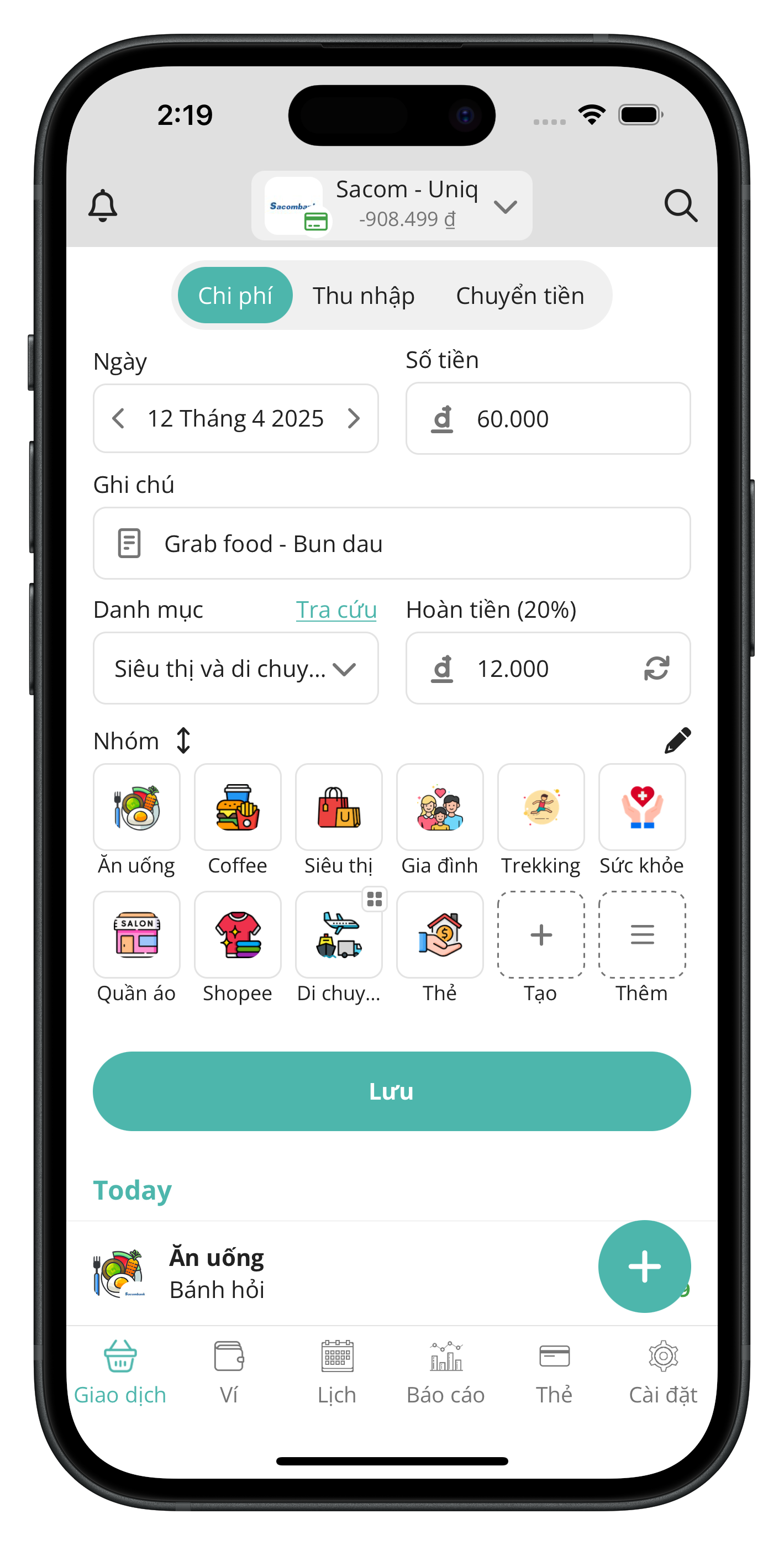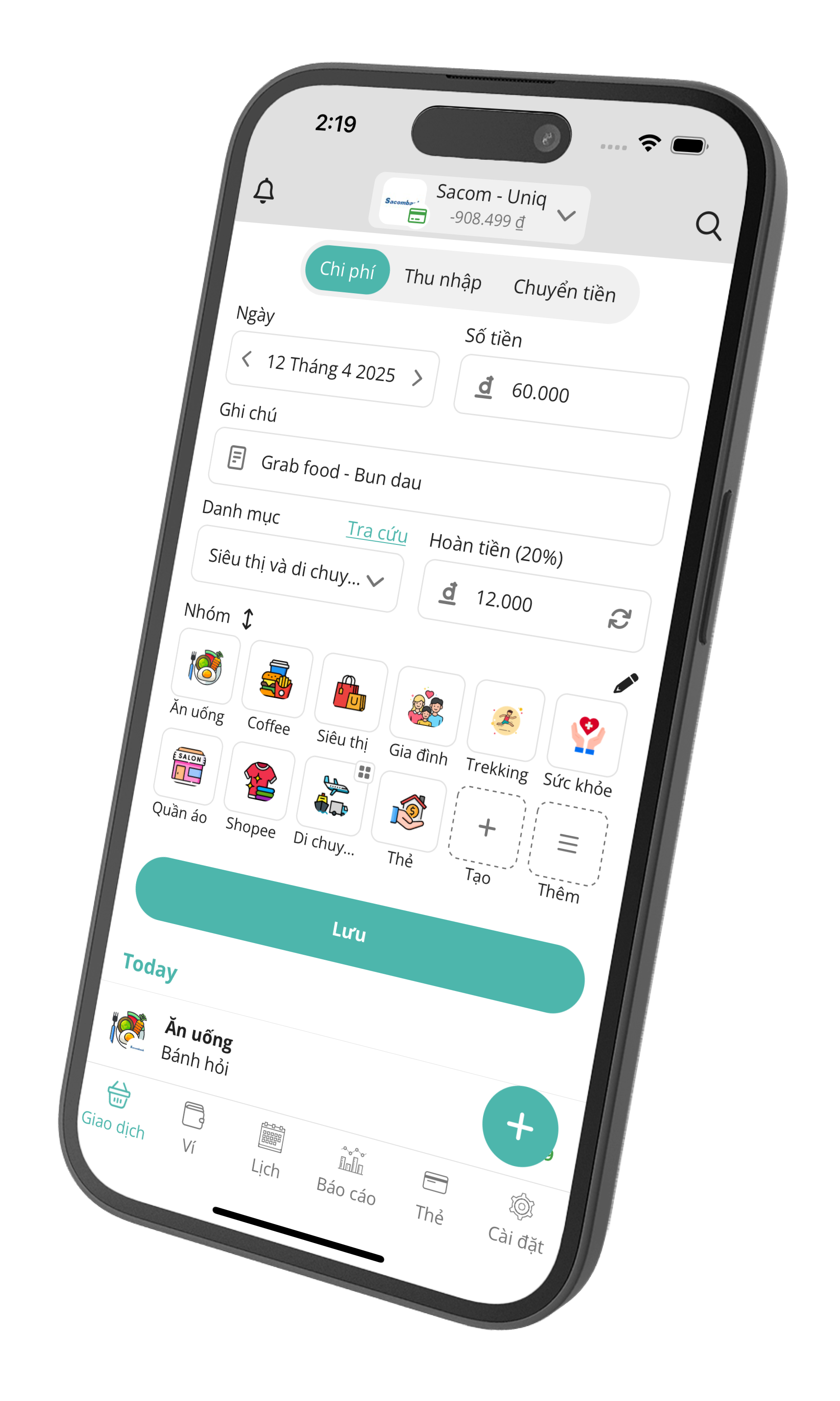 Giao diện tối ưu thao tác, nhập giao dịch chỉ trong vài giây. Sổ Chi Tiêu còn sử dụng AI để tự động phân loại giao dịch của bạn